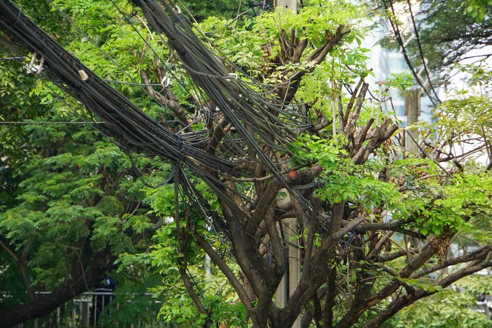 Asian cities are famous for the chaotic wiring that goes through everywhere even through the trees if needed.