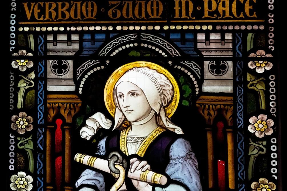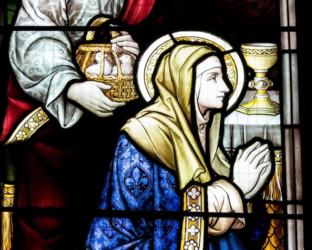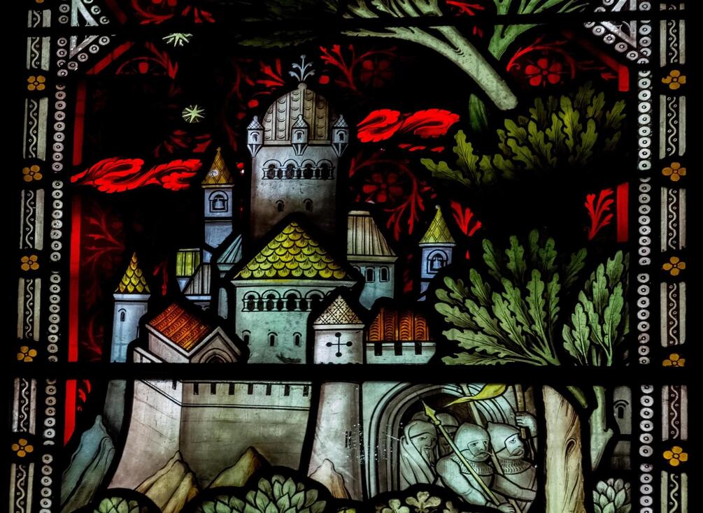 A photo collection of neo-gothic cathedral stained glass depicting biblical scenes.