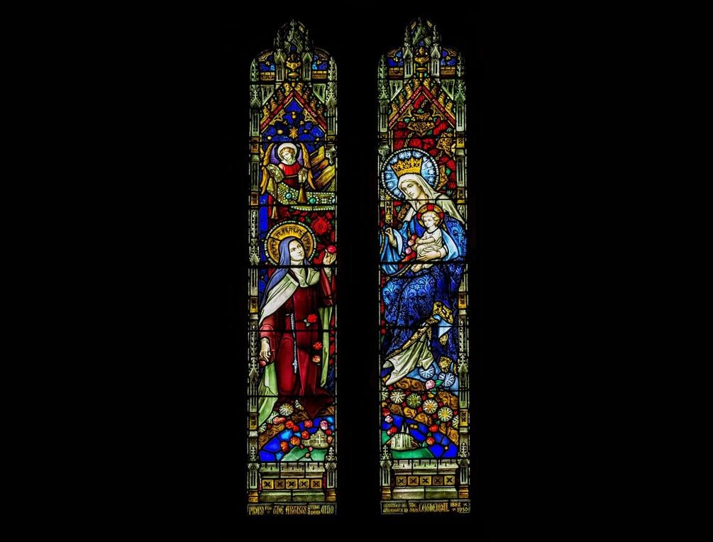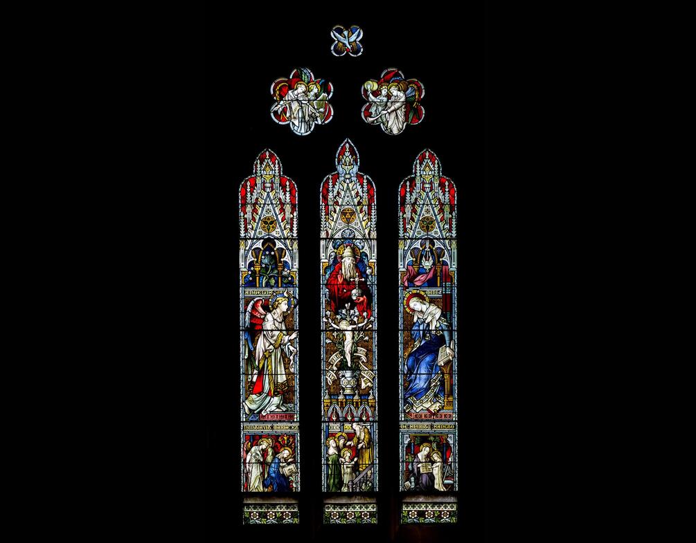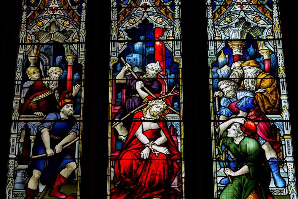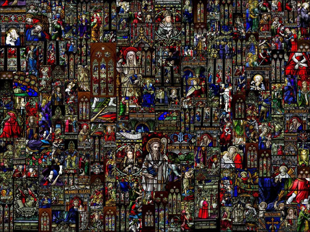 A photo collection of neo-gothic cathedral stained glass depicting biblical scenes.