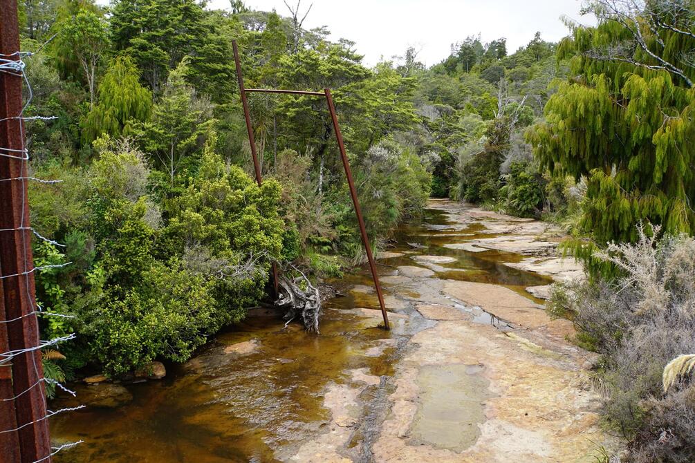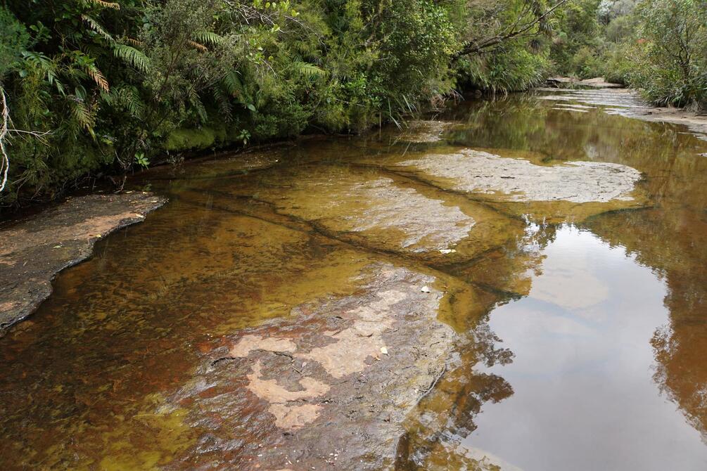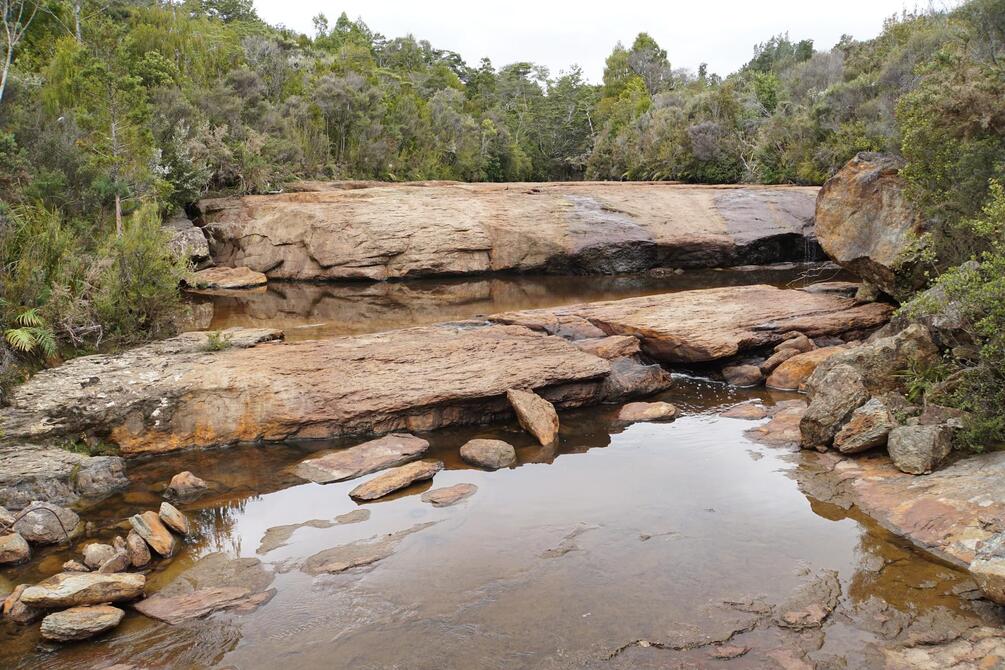 Shallow semi-dried creek running on the rusty coloured plateau.